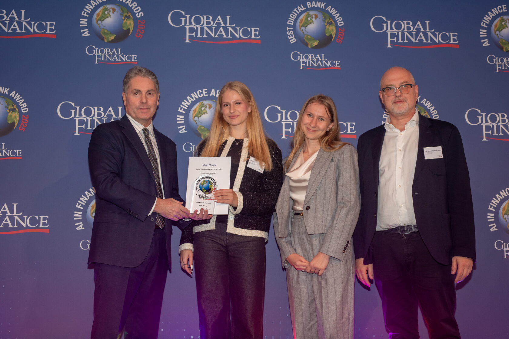 В торжественной обстановке представителям Mind Money: главе компании Юлии Хандошко, исполнительному директору и руководителю отдела управления портфелем Алексею Афанасьевскому и аналитику LSE Анастасии Волковой был вручен приз в номинации Top Innovations in Finance 2025 – Western Europe за разработку системы оценки погодных рисков.